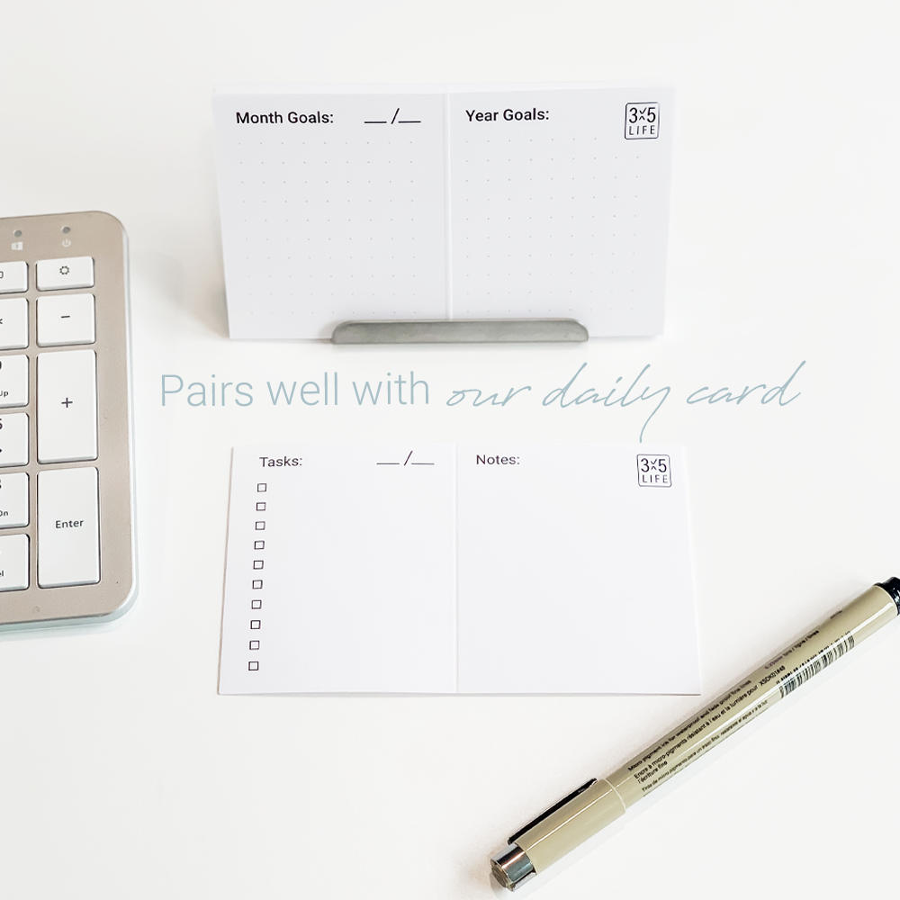 Introducing 3x5 Life’s new monthly goal cards. On the front of each card is your monthly goals and your big yearly goals. On the back is where you reflect at the end of each month. A section for monthly wins and areas that “need work”.